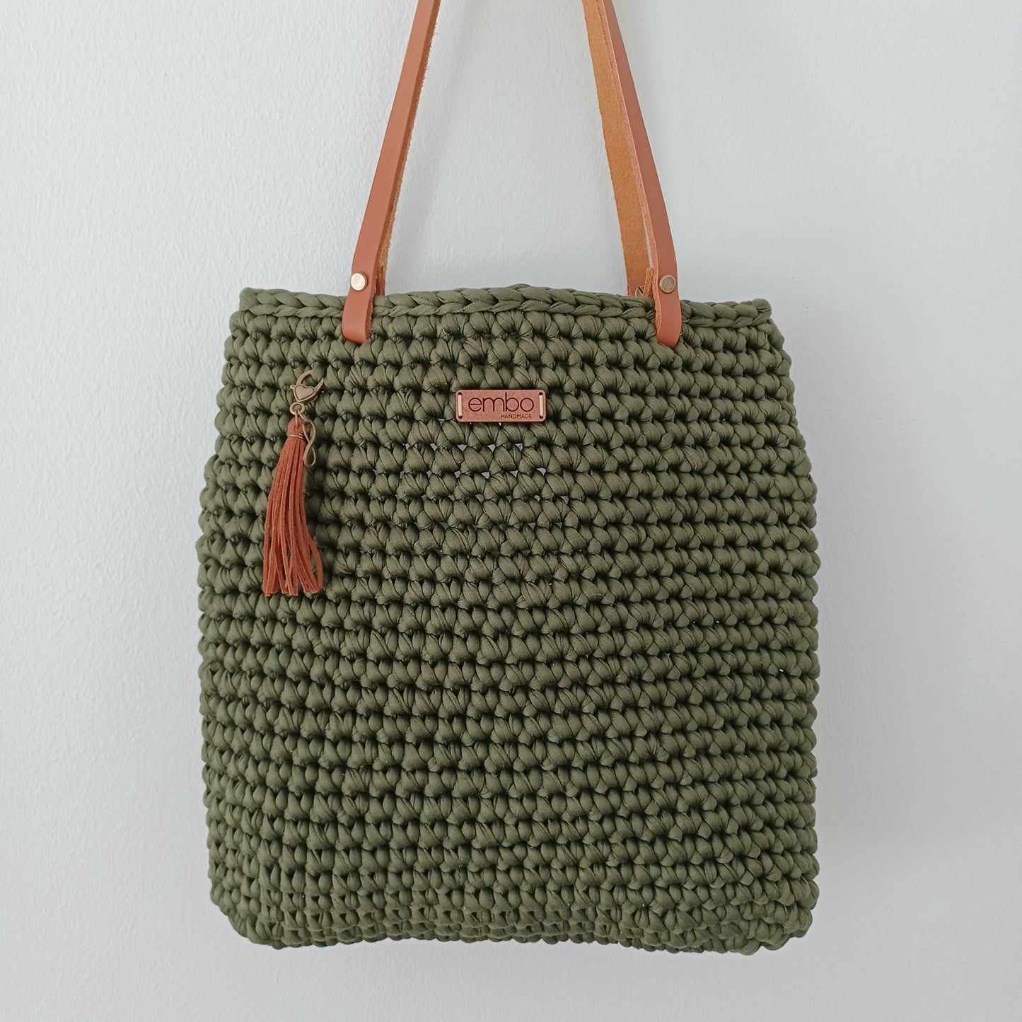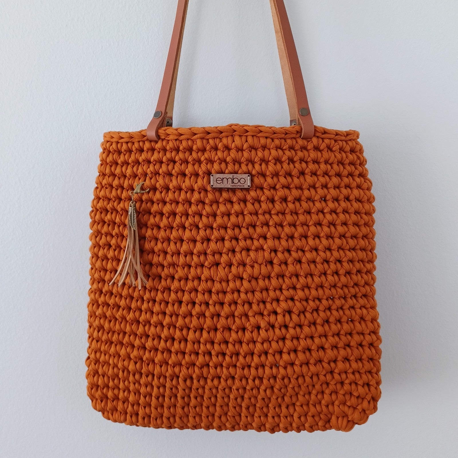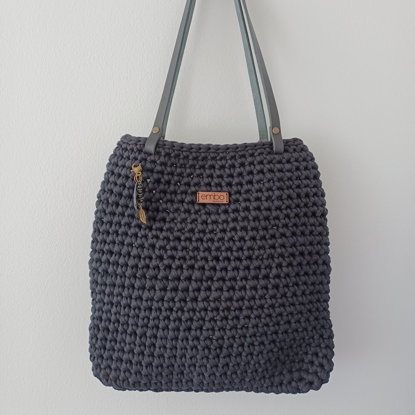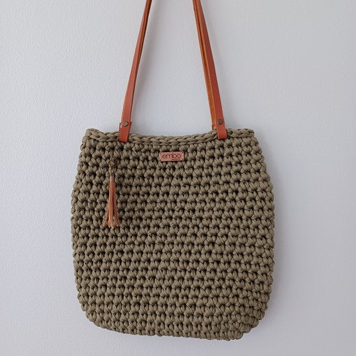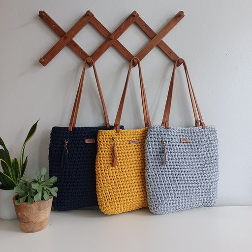 It is crocheted from recycled fabric and is strong enough to last you a lifetime. It is finished with genuine leather handles , which are easily removed when you need to wash your bag.